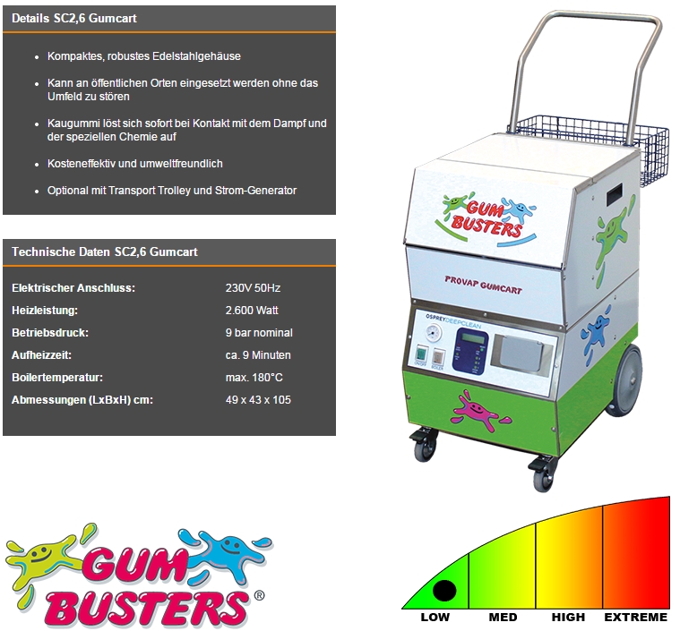 Kaugummientferner SC2,6 – Gumbuster 15/05/2025 | Keine Kommentare 5.355,00 CHF Grundpreisangabe:/Bestellnunmern:EAN: AAN: Produkt kaufen Artikelnummer: 17cfb28ffd1d Kategorien: Industriedampfreiniger / Sauger, Reinigungsgeräte, Vapor Dampfreiniger Beschreibung Beschreibung Trockendampf-Kaugummientferner Gumbuster2,6kW GumCart – kompaktes Edelstahlgehäuse 230V, 2.600Watt, Aufheizzeit: 9Minuten, Reinigungsmittelzugabe mögl Lieferzeit:3-5 Werktage für Deutschland Ähnliche Produkte Desinfektionszerstäuber 57,00 CHF Produkt kaufen Ablauf-Reinigungs-Düse Nur-Dampf für Premium Dampfsauger 25,00 CHF Produkt kaufen Dampf-Saugschlauch Lange Ausführung 5m Premium 381,70 CHF Produkt kaufen Fensterwischer für Premium Dampfsauger 31,90 CHF Produkt kaufen